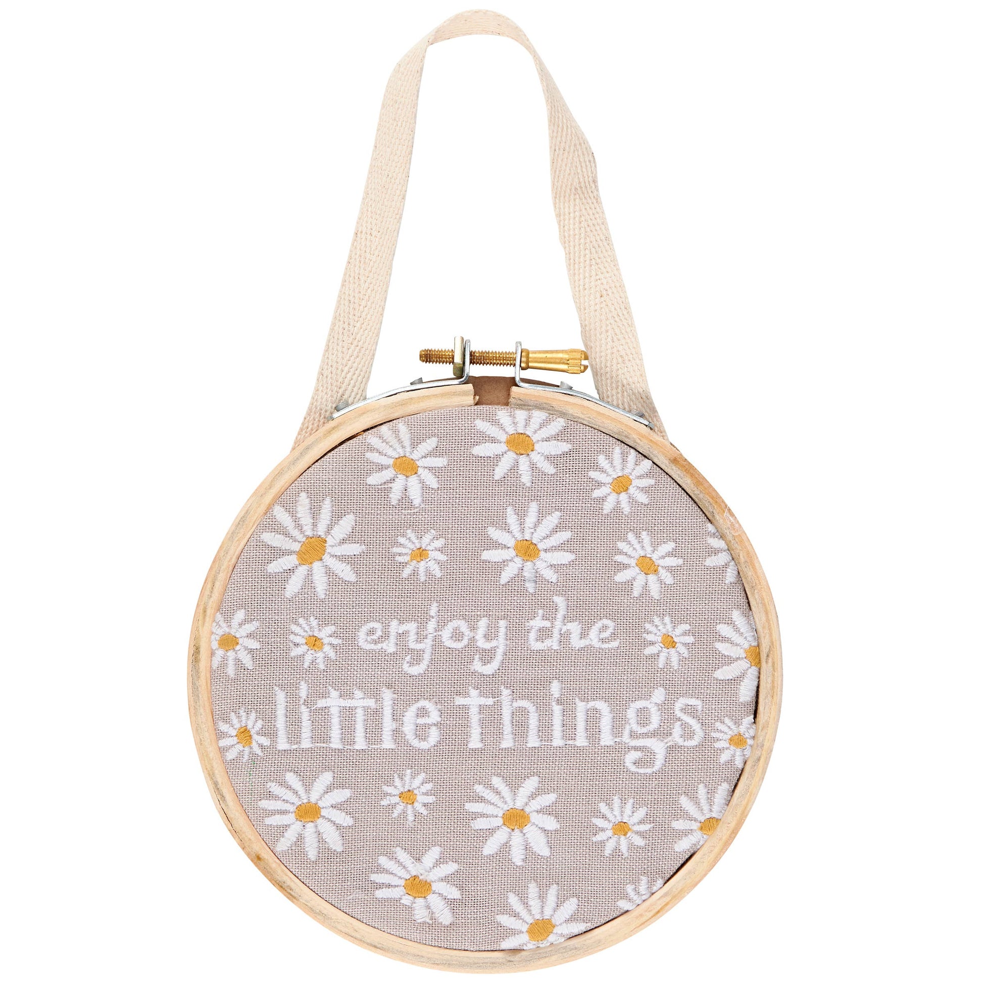 A decorative hoop from our Stitch Art Collection displaying delightful daisies surrounding an inspirational sentiment that reads "Enjoy The Little Things." Designs are embroidered on linen and fixed to solid wood base with metal clasp and screw designed to resemble an embroidery hoop. Our Enjoy The Little Things hoop is easy to hang via cotton loop attached behind clasp. An inspirational everyday home accent with a variety of display options.